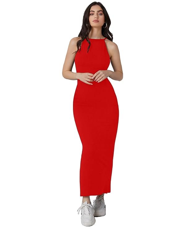 Aahwan Solid Halter Neck Solid Bodycon Midi Dress for Women’s & Girl’s Red
