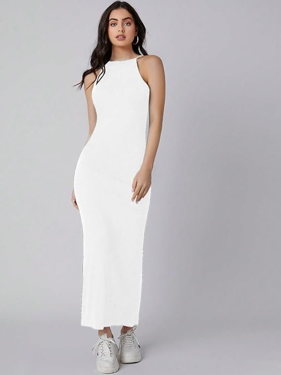 Aahwan Solid Halter Neck Solid Bodycon Midi Dress for Women’s & Girl’s White