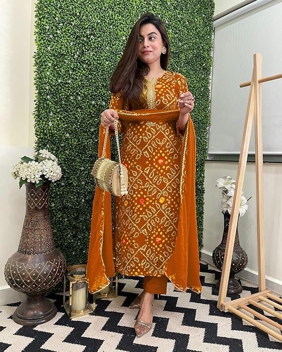 GoSriKi Women’s Rayon Viscose Straight Bandhej Printed Kurta with Pant & Dupatta Mustard