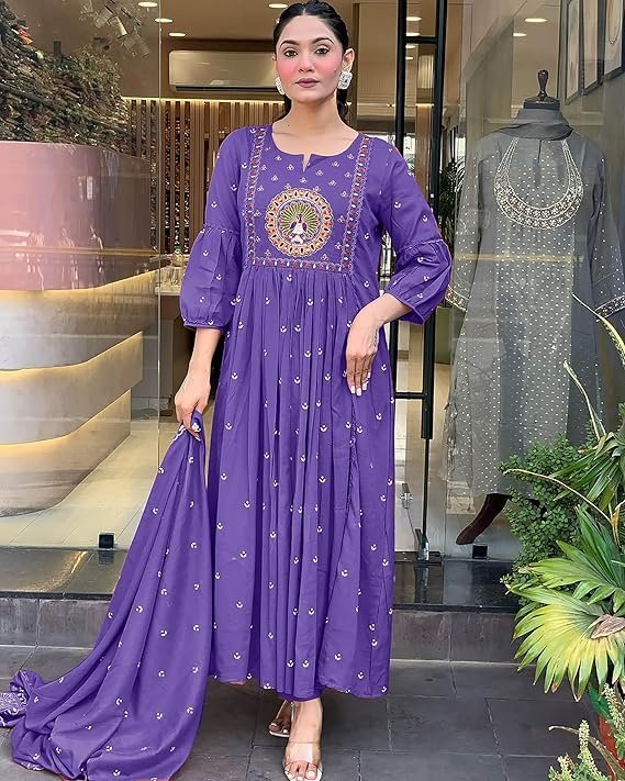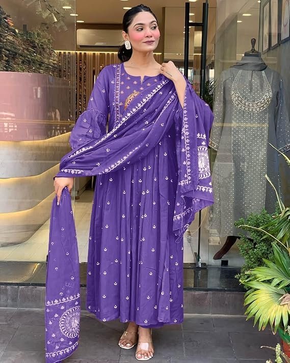KLOSIA Women Rayon Printed Anarkali Kurta Set with Dupatta Purple