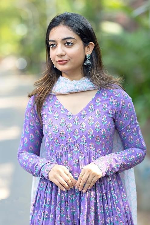 Nermosa Women Printed Anarkali Kurta and Pant Set with Dupatta Purple