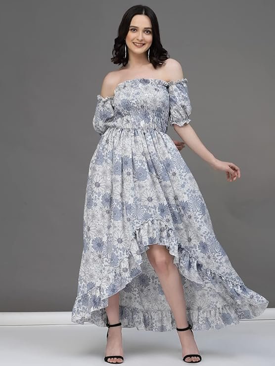 OOMPH! Flared Dress for Women Stylish | Long One Piece for Women | Off Shoulder Puff Sleeve Long Dress | Floral Print Maxi One Piece | Western & Fusion wear Bohemian Style Light Grey