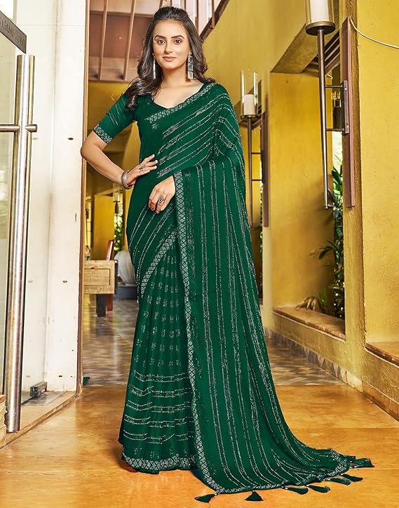 SIRIL Women’s Chiffon Hot Fixing Stone Work Saree With Unstitched Blouse Piece Dark Green
