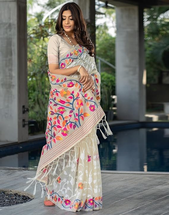 SIRIL Women’s Cotton Jacquard Saree With Unstitched Blouse Piece Cream