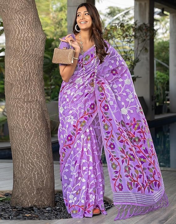 SIRIL Women’s Cotton Jacquard Saree With Unstitched Blouse Piece Lavender